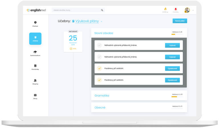 Ve virtuálních učebnách englishme! pro vás průběžně přibývá nový obsah. Trénujete s výukovými plány, které vám chystá program. Nebo zvolíte individuální cestu.