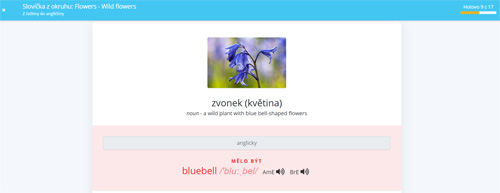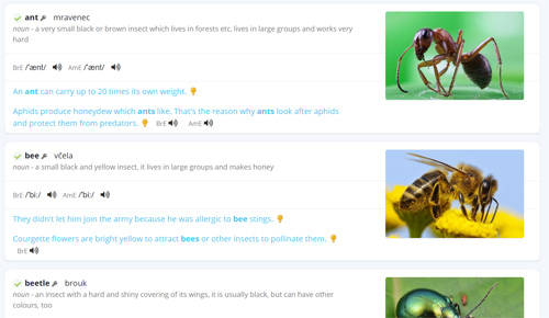 Pokud si ovšem netroufáte slovíčka zkoušet rovnou, můžete si nejprve okruh projít v seznamu, kde najdete překlady slov i příkladové věty a také je zde možnost si slovíčka (a některé příkladové věty) poslechnout.