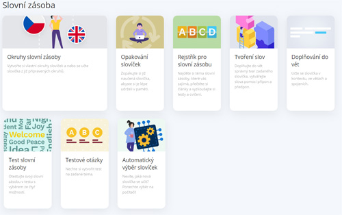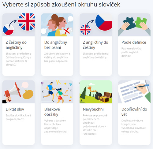 Po kliknutí na samostudium najdete v první části slovní zásobu. Ta se skládá z mnoha prvků – jsou to různé druhy zkoušení vybrané slovní zásoby.