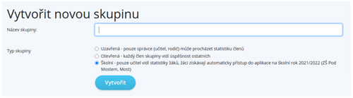 • Školní – tato možnost se zobrazuje pouze školám, které mají zakoupenou hromadnou licenci. Jedná se také o uzavřenou skupinu, tedy skupinu, která má svého učitele a jednotliví členové nevidí navzájem své výsledky. Členové této skupiny získávají přístup do aplikace na základě školní licence.